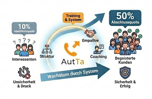 Mit AutTa ändern wir das. Wir trainieren nicht für Kaltakquise, sondern für den maximalen ROI Ihrer bestehenden Kontakte. Lernen Sie, wie Sie vorqualifizierte Leads souverän zum Abschluss führen – mit einer Methode, die Ihnen und dem Kunden Spaß macht.